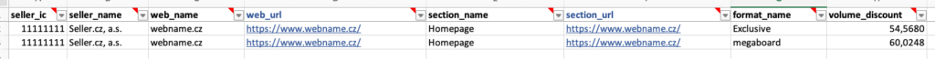 Soubor importu pak obsahuje informace o prodejci (IČO, název), název a URL webu, níázev a URL sekce a název formátu. Posledním sloupečkem je volume_discount, neboli číslo odpovídající % hodnotě slevy na daný placement.