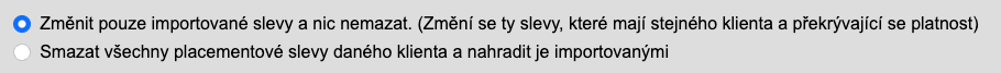 První volba aktualizuje ty slevy, které importujete a ostatní nechá na pokoji být. Druhá volba smaže všechny aktuálně existující slevy pro patřičného klienta a vloží ty co importujete, takže budou existovat pouze tyto nové.