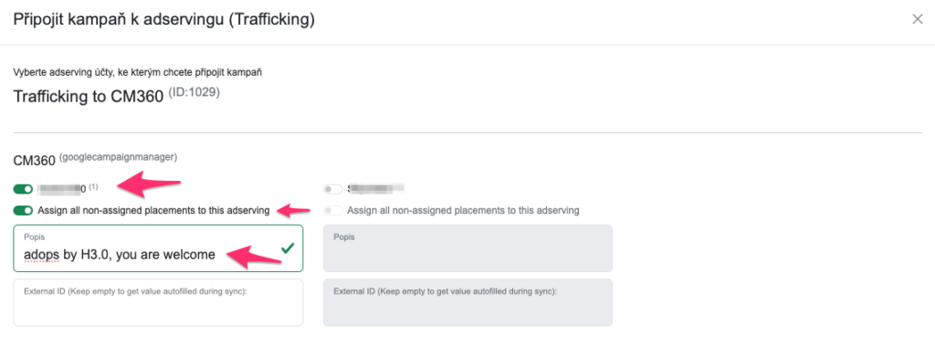 V druhém checkboxu “Assign all non-assigned placements to this adserving” je možné zapnout funkcionalitu, která v případě přidání placementů do kampaně tyto naasignuje k synchronizaci s daným systémem.