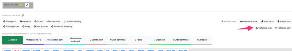 Kliknutím na toto tlačítko Trafficking sync si kampaň sesynchronizujete se všemi napojenými adservingy = kampaň se na traffickuje do CM360.