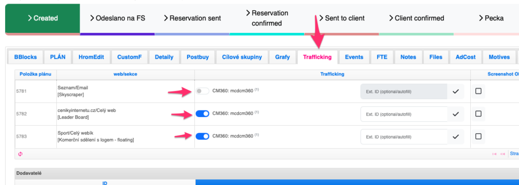 Poté, co máte nastavené propojení placementů i klientů, můžete přejít k samotnému aktu traffickingu.