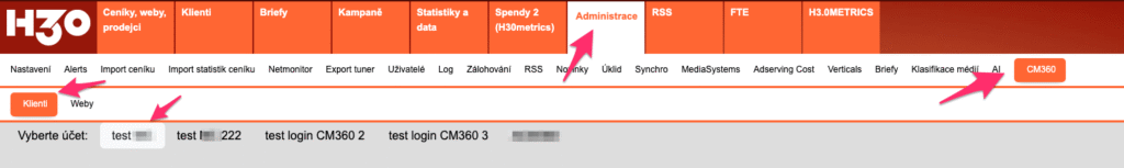 Synchronizace Klientů v Administrace/CM360/Klienti klikněte v horním boxu pod menu na patřičný login do CM360, který máte v H3.0 zadaný.
