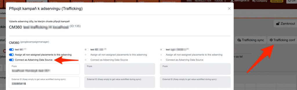 Po kliknutí na tlačítko Trafficking conf budete moci napojit adservingový systém na danou kampaň pro účely traffickingu.