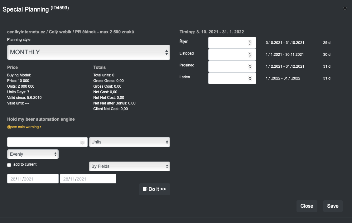 V čem je ale náš modul Special planning nejnádhernější je již několikrát výše zmiňovaný modul Hold my beer automation engine. Tento modul dokáže polointeligentně, nebo možná alespoň poloautomaticky rozložit vaši kampaň do zvoleného časového období.