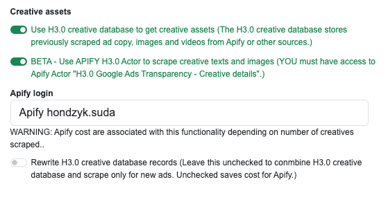 Po zaškrtnutí checboxu “Use APIFY H3.0 actor to scrape creative texts and images”, který zajistí to, že se použije Apify pro stažení kreativ (pokud ho máte aktivovaný), se objeví dolní Pulldown s loginy do APify a další checkbox.