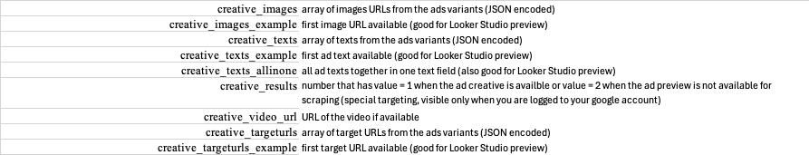 No a na závěr tuto funkci aktivujete v DataTasku. V Google Ads Transparency datatasku je to dole v sekci Creative assets, která vypadá asi takto: